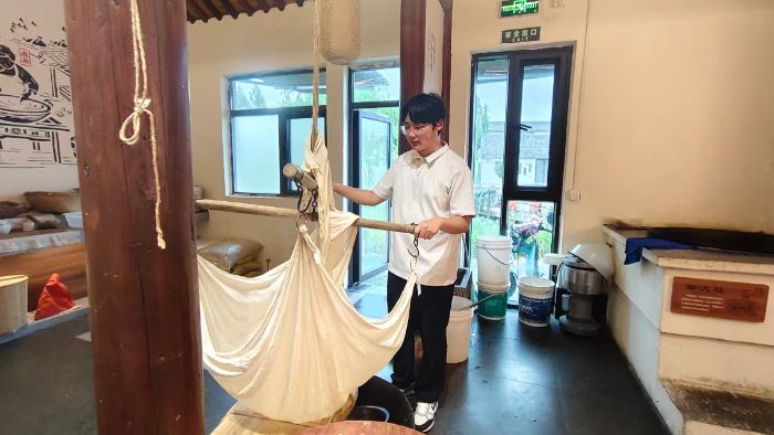 不同于傳統作坊的經驗化操作,林里豆腐坊的墻壁上繪制著《豆腐古法制作流程圖》,從“選豆—浸泡”到“點鹵—壓制成型”,每一步工序都標注著具體細節與操作訣竅。團隊觀察到,不少村民和游客會駐足觀看,孩子們更是圍繞流程圖追問工藝原理。“以前做豆腐靠‘手感’,現在有了流程圖,年輕人想學就有章可循。”豆腐坊孫師傅的話讓團隊深受啟發。成員們認為,這種將隱性經驗轉化為顯性知識的做法,打破了傳統技藝“傳內不傳外、傳男不傳女”的局限,通過可視化、標準化的呈現,讓老手藝更易被年輕一代接受和學習。在李師傅的指導下,團隊成員親身體驗豆腐制作,更深刻體會到傳統技藝在現代語境下傳承的必要性與可行性。
