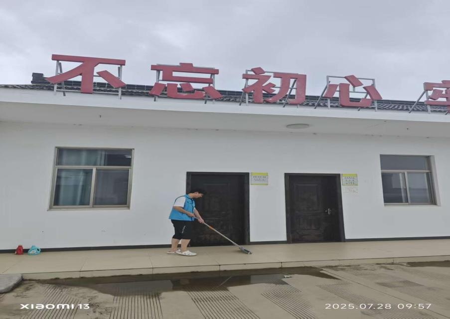 同時,施同學來到了老家的村委會。擦拭窗戶、清掃地面,陽光透過干凈的玻璃灑了進來。汗水雖濕透衣背,但看著煥然一新的活動室,心里滿是為鄉親們服務的踏實和快樂。