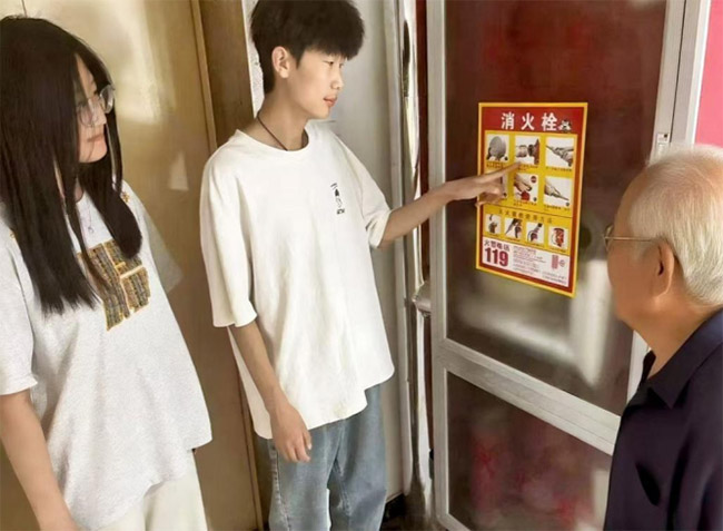 同時,實踐成員們還向老人講解了消防知識,重點介紹了滅火器使用方法、應急逃生路線和日常用電安全等實用知識。為確保效果,志愿者們還組織了小型演練,手把手指導老人操作滅火器,為老人的居住安全提供了一份保障。