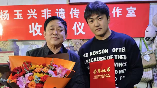 圖為卞昭棟向國家級非遺傳承人楊玉興拜師學藝。卞昭棟 供圖