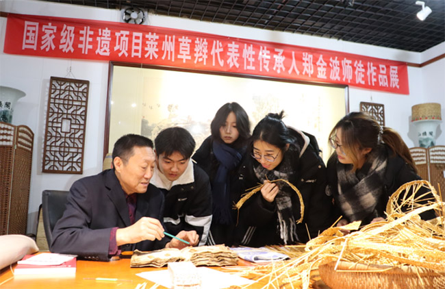 圖為“星火草蘊”青年團隊成員與國家級草編非遺傳承人鄭金波進行交流學習。于昕禾 供圖
