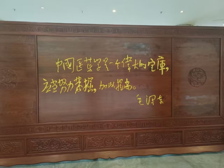 門口木屏風處,屏風后刻著毛主席的評語:“中國醫藥學是一個偉大的寶庫,應當努力發掘,加以提高。”