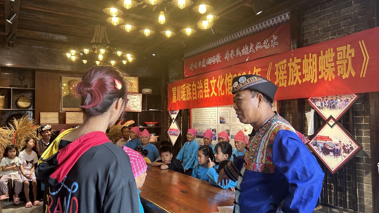 8月22日,團隊攜手富川瑤族自治縣文化館下鄉抵達下蓮塘村,踏入了一座承載著深厚文化底蘊的非遺傳習館。在這里,隊員們不僅有幸聆聽了悠揚動聽的蝴蝶歌,感受蝴蝶歌的獨特魅力和風情,更榮幸地參訪了非遺蝴蝶歌傳承人陳季花老師。在他的帶領下,隊員們不僅進一步熟悉蝴蝶歌的悠久歷史和歌唱特點,更深刻理解了其背后蘊含的民族文化、歷史故事以及生活哲理。這場別開生面的文化交流活動,不僅讓團隊成員們領略到了瑤族文化的博大精深,也激發了她們對傳統文化保護與傳承的責任感與使命感。