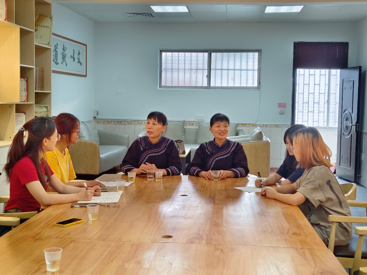 緊接著,在林館長的介紹下,隊員有幸采訪了非遺蝴蝶歌自治區級傳承人歐玉梅老師和市級傳承人陳麗老師。訪談中,隊員認真記錄下傳承人分享的工作計劃與內容,同時了解到其中的眾多臨時組織和隨機性工作,這些工作側面反映著傳承人為文化傳承事業不畏辛勞、盡職盡責的美好品質,隊員在體會傳承細節的同時,亦感受到是德藝雙馨的傳承工作者無私付出,讓非遺煥發出新的榮光。
