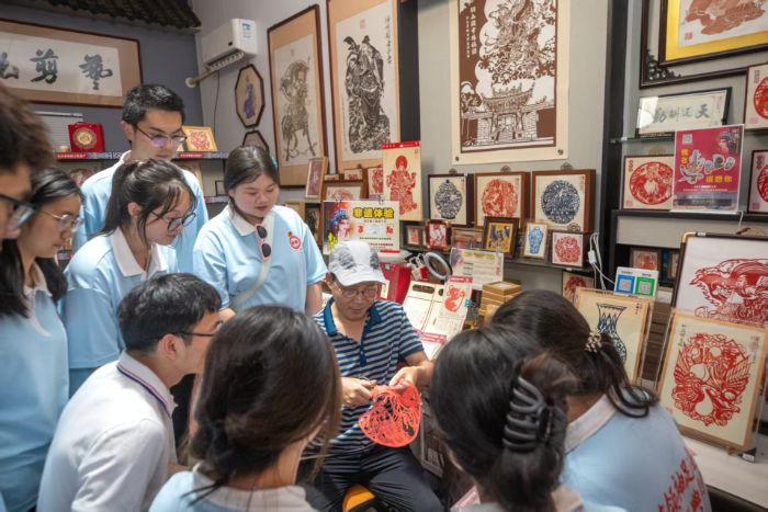 實踐隊員們走進東山非遺工坊,面對一幅幅精美的剪紙和一件件古樸的海柳雕,駐足細觀。他們聆聽非遺傳承人的專業講解,了解剪紙中蘊含的漁家風情與吉祥寓意,探究海柳雕選材、雕刻、打磨等環節的獨特技藝,近距離感受非遺的魅力。?