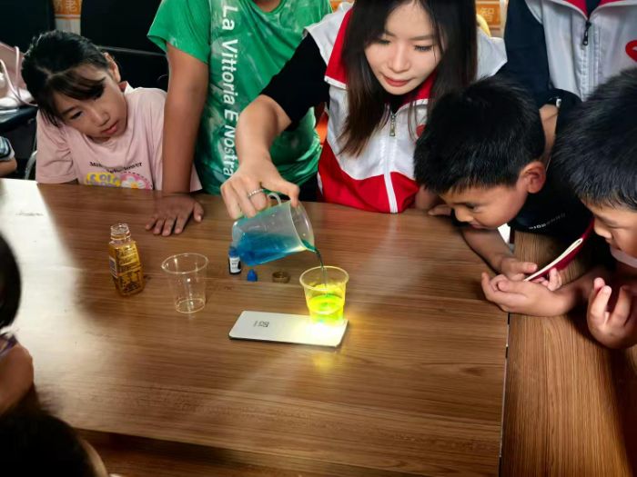 科學探索,是點燃青少年智慧之光的璀璨火花。“七彩假期”科學實驗課上,看著孩子們化身為小小科學家,積極參與“螢火流星雨”“奇幻熔巖燈”等精彩實驗。實踐團結合實驗現象,深入淺出地講解科學原理,希望能激發孩子們對科學的好奇與熱愛??粗麄冊谟^察中思考,在思考中成長,觀察力和邏輯思維能力得到充分鍛煉,我們知道這為他們未來的科學探索之路奠定了堅實基礎。