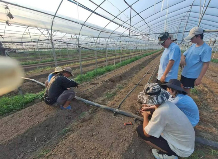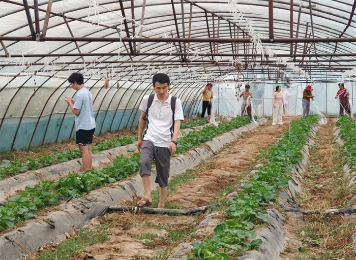 7月21日至25日,隊員們駐扎賀村集村,開展為期五天的田間勞動實踐。在張樹鋒書記的指導下,團隊進入悶熱的蜜瓜大棚,學習鋪設(shè)澆灌管道、覆蓋地膜,協(xié)助運送瓜苗、農(nóng)藥,親身體驗“汗滴禾下土”的辛勞,深刻理解現(xiàn)代農(nóng)業(yè)精細化管理的重要性,將理論知識與農(nóng)耕實踐緊密結(jié)合。信息與計算科學2303班楊昊看著剛覆好的地膜感慨道:“以前總覺得種地靠經(jīng)驗,現(xiàn)在才知道,從溫度控制到水肥管理,每一步都得精準把控,每個環(huán)節(jié)都凝聚著技術(shù)含量與管理智慧。”