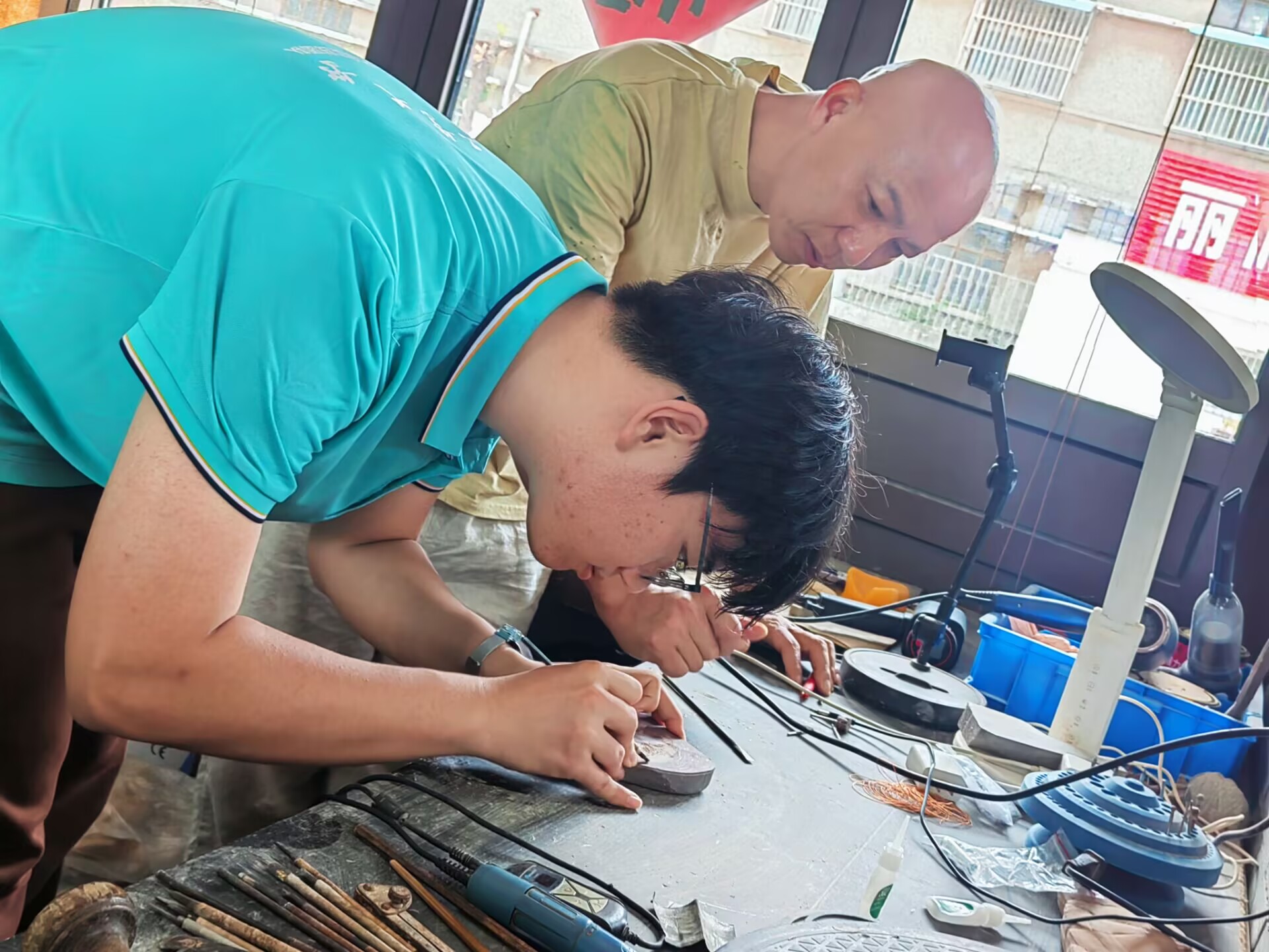 對話匠心:方寸硯臺間的畢生堅守 7月7日上午,團(tuán)隊拜訪了紫金硯制作技藝省級代表性傳承人馮長文先生。馮先生如數(shù)家珍般講述了紫金硯的千年淵源與興衰歷程。結(jié)合數(shù)十年經(jīng)驗,他系統(tǒng)解析了從選材、構(gòu)思、雕刻到打磨的完整工藝流程,其深厚的專業(yè)素養(yǎng)令學(xué)子們深刻感受到紫金硯承載的歷史厚重與匠人智慧。
