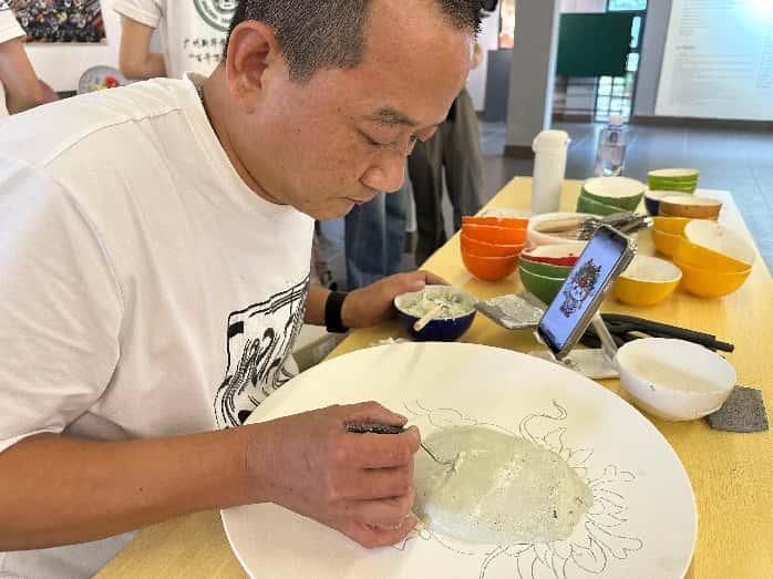 粘貼環節,遵循老師傳授的技法,以專用粘合劑固定瓷片,從阿瓷頭部龍飾開始,細致排布,確保瓷片貼合且色彩過渡自然,逐步完成身體、服飾等部分,讓阿瓷形象在瓷片拼接中鮮活呈現。