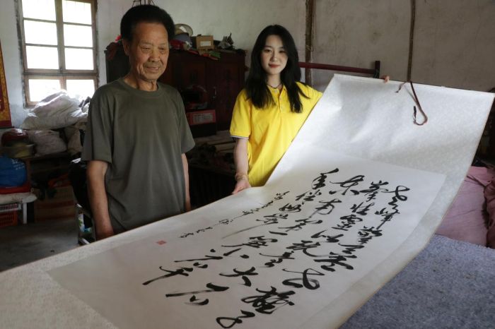 “這是我去年寫的,你們看看。”交談間,爺爺從里屋取出一卷書法作品,緩緩展開。宣紙上,字跡力透紙背,筆鋒間既有歲月的蒼勁,又有信仰的堅定。