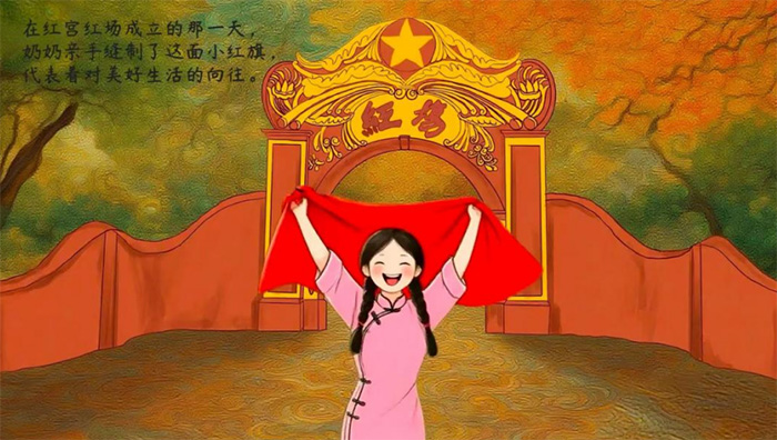 為讓紅宮紅場的紅色故事更生動(dòng)地傳遞,實(shí)踐隊(duì)精心創(chuàng)作相關(guān)繪本。繪本中,一幅畫面尤為動(dòng)人:在紅宮紅場的大門前,一位革命者高舉其親手縫制的紅旗,旗幟鮮紅似火,映照著對美好生活的向往。
