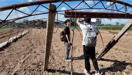 圖為實(shí)踐團(tuán)成員走訪當(dāng)?shù)胤N植戶記錄現(xiàn)有大棚結(jié)構(gòu)老化等使用痛點(diǎn)及改造期望。供圖 周子涵