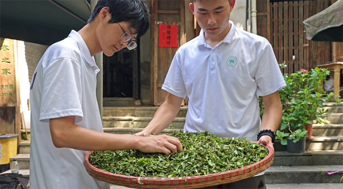 實踐收官日,實踐隊化身“一日茶農”深度體驗。清晨跟隨茶農入園,凝神學習“提手采”的指尖藝術,輕取“兩葉一芯”的鮮葉精華。面對滾燙的鐵鍋,在茶農指導下親身體驗“抖、搭、捺、拓”的炒制技法,掌心的灼痕讓“慢工出細活”的匠心刻骨銘心。曬青時親手攤鋪鮮葉,直觀體會陽光和微風如何影響茶葉。當勞作之后,喝下早已備好的西湖龍井茶,那清澈微澀、而后回甘的滋味,讓書本上的“龍井四絕”真正鮮活起來。這段親手勞作的體驗,讓實踐隊對制茶智慧理解更深,并將成為后續(xù)為梅家塢茶旅融合獻策最扎實的基礎。