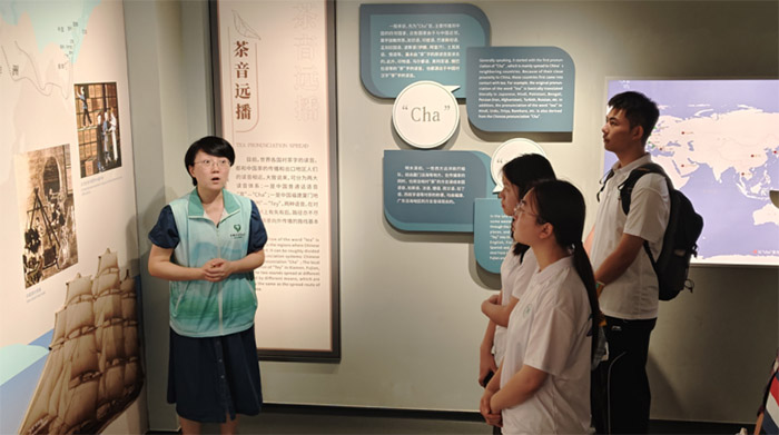 翌日,實踐隊探訪中國茶葉博物館。其中雙峰館區(qū)有茶史、茶萃、茶事、茶具、茶俗五大展廳,講解員從茶的六大品類切入,沿著歷史脈絡,深入講述各個朝代茶葉在種植、工藝、文化等方面的發(fā)展與變遷,生動呈現中國茶業(yè)的復興歷程與當代活力;龍井館區(qū)更以全球視野梳理了茶史的壯闊脈絡,印證了“茶為世界通用語”的深遠影響力。在龍井館區(qū)的非遺展廳中,集中呈現“十大手法”炒制技藝、普洱茶后發(fā)酵智慧等中華茶文化瑰寶,進一步堅定了實踐隊守護文化根脈、傳承非遺技藝的決心。