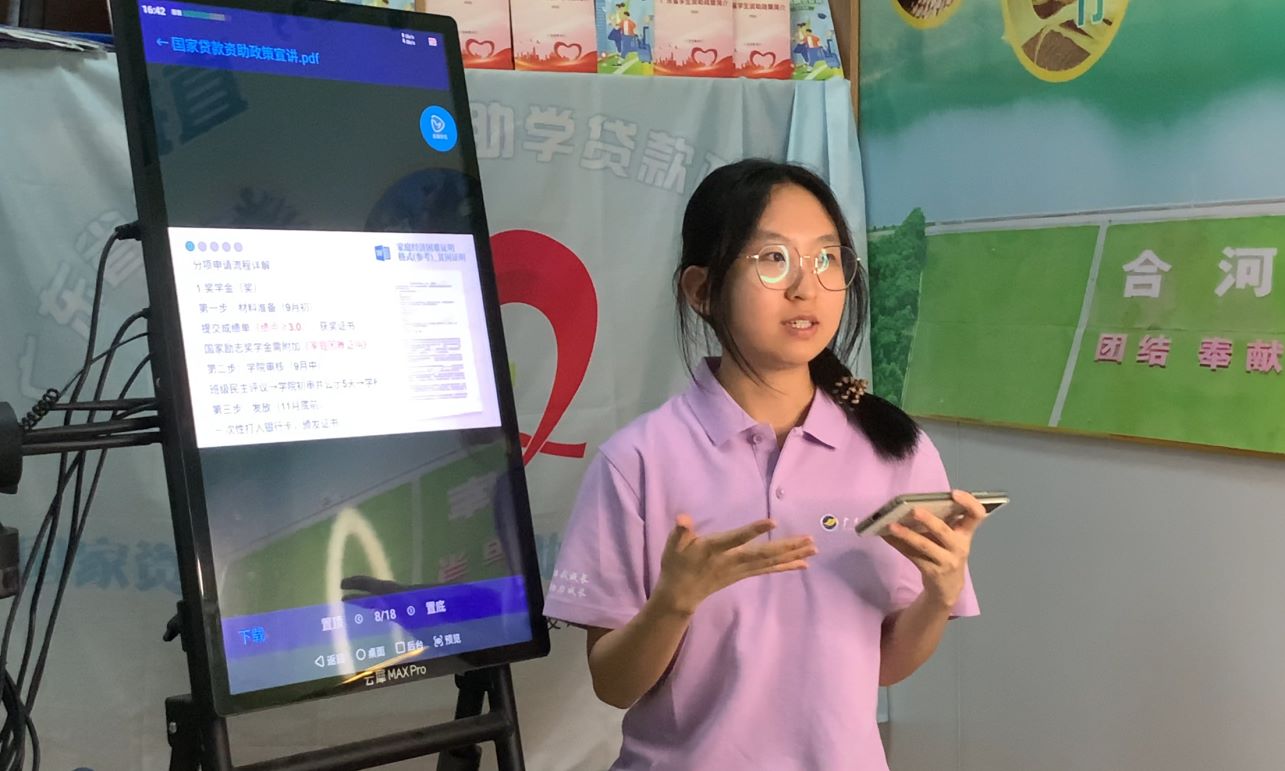 抵達合水村時,村委文化廣場已積起水洼,原定的戶外咨詢臺無法搭建。隊員們索性在村委屋檐下支起臨時攤位,雨水順著屋檐滴落,他們就用塑料布墊著宣傳冊,繼續向冒雨前來的村民發放《國家學生資助政策一本通》。“聽說有政策,但咱這地方偏,沒人細說過。” 一位披著蓑衣的大叔接過宣傳冊,指尖在 “助學金” 三個字上反復摩挲。