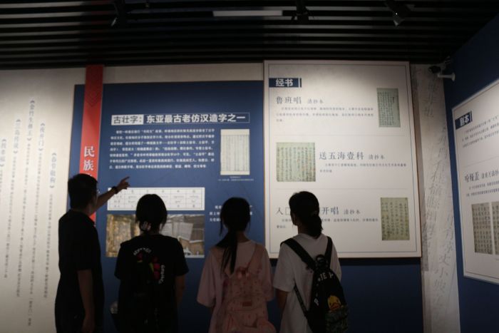 7月4日上午9點,“壯典薪火調研團”前往廣西壯族自治區圖書館參觀。團隊成員們跟隨著圖書館里的“鐘靈毓秀,桂生于斯——典籍里的八桂文化展”開展了一場跨越千年的文化沉浸之旅。本次展覽分為“歷史傳承”“多彩民族”“人杰地靈”“山水人文”“物華天寶”五個單元。在展覽中,團隊成員看到了50余件古籍,這些古籍的呈現方式多種多樣,有實體性資源的比如一些手稿抄本,有數字化的資源,比如京族民歌、仫佬族古歌等原生態音頻和充滿智能互動性的《廖江竹枝詞》。這些古籍呈現方式給團隊成員們帶來極大的震撼,一些隊員表示,通過技術為古籍賦能,這才是真正地實現典籍的活化利用。