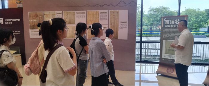 7月3日上午8點,“壯典薪火調研團”前往南寧市國家檔案館進行參觀。在檔案館工作人員的熱情接待和專業指導下,團隊成員們進入檔案館大廳和查閱室。工作人員首先向大家介紹了檔案館的館藏情況以及壯族檔案的整理與保管工作。在這期間,講解員引導團隊成員們參觀壯族契約文書。在講解員熱情的介紹下,成員們俯身凝視著契約上的每一處細節,有人用手機拍下文字細節準備后期考證,有人輕聲討論著其中體現的民俗習慣。在參觀過程中,團隊成員們還了解到,廣西國家檔案館采取了數字化掃描、修復破損檔案等一系列措施來保護這些珍貴的壯族檔案。在參觀的最后,在館長的帶頭下,團隊成員們紛紛在“誠信契約”上簽字,以此來表示保護與宣傳壯族古籍與民族檔案的積極態度。