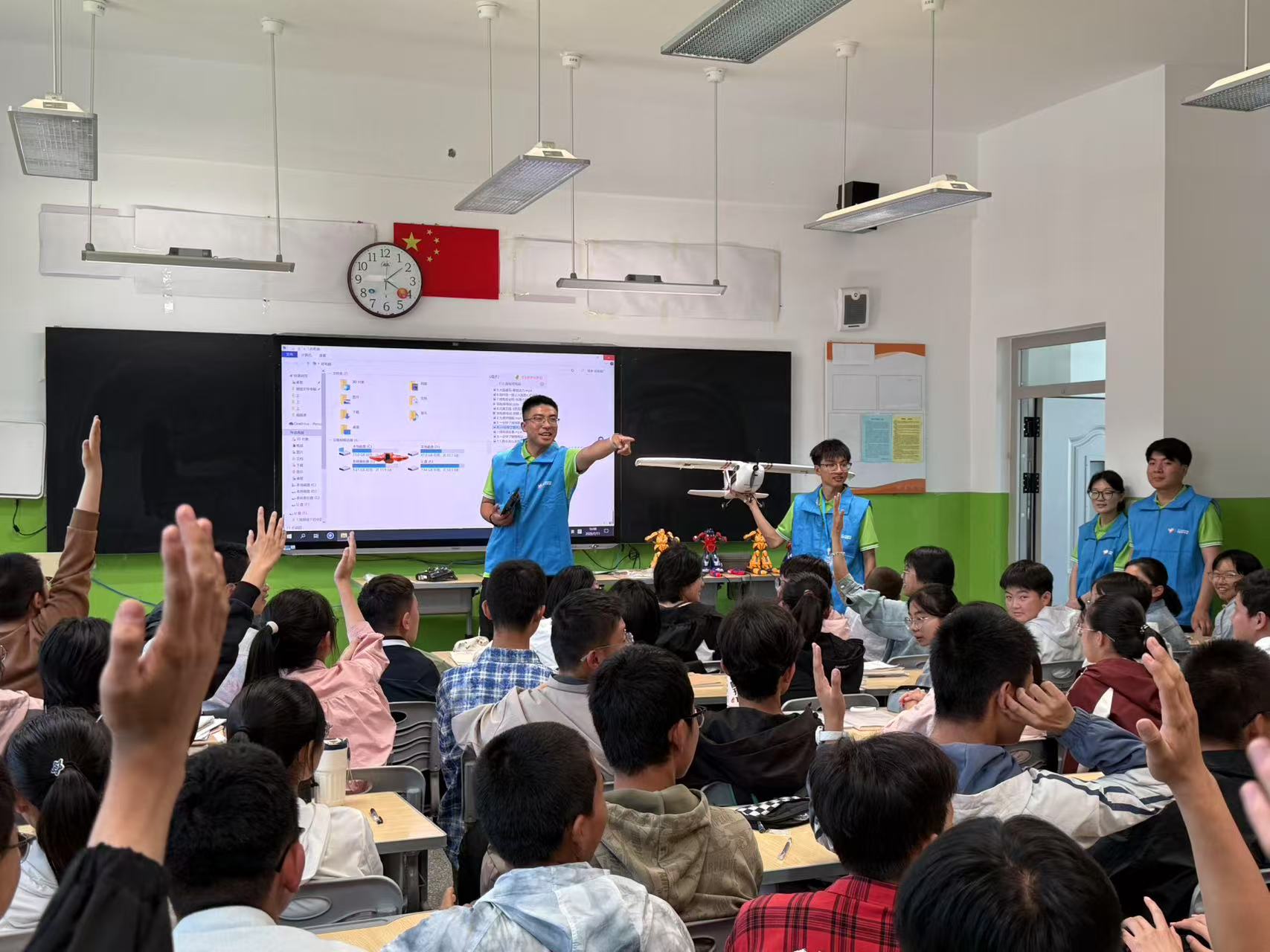 在互動(dòng)環(huán)節(jié),宣講團(tuán)成員們帶來了航模飛機(jī)、四旋翼無人機(jī)和各斗機(jī)器人模型。“原來遙控飛行背后的原理是這樣的!”、“機(jī)器人的搏斗是怎么實(shí)現(xiàn)的?”同學(xué)們圍攏在模型前,志愿者們耐心解答同學(xué)們的問題,講解模型的原理。“原來課本里的物理知識能這樣應(yīng)用到實(shí)際!”一位參與模型操作的同學(xué)興奮地說。此次互動(dòng),是“兩彈一星”精神的生動(dòng)詮釋,更在雪域少年的心中深深埋下了探索真理、勇攀科技高峰的火種。