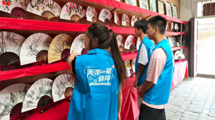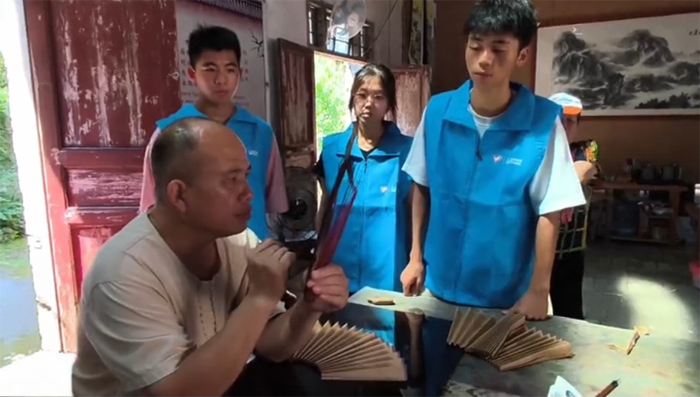 扇藝匠人專注演示,手中工具在扇骨、扇面材料間穿梭,精心組裝、拼接,將零散部件變為初具雛形的畫扇。幾位身著藍色志愿服的大學生圍站一旁,目光緊鎖匠人動作,認真學習畫扇制作流程,從材料裁剪、部件拼接,到整體成型,不放過每個細節。