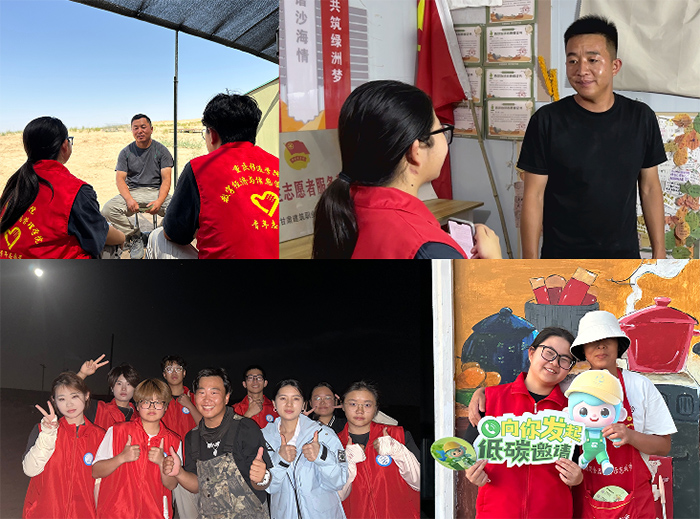 成員們聆聽無私奉獻的故事,用鏡頭和筆記錄平凡而偉大的身影。采訪后勤阿姨與基地工作人員,他們日復一日默默堅守,為治沙事業筑起堅實后盾;探訪治沙人,他們與風沙殊死搏斗,每一個抗爭瞬間都譜就動人樂章。在這些平凡堅守中,青年們領悟到“困難面前不低頭、敢把沙漠變綠洲”的民勤精神要義。這是民勤人民在與風沙搏斗中錘煉出的鋼鐵意志,是他們在絕境逆境中奮勇前行的磅礴動力,激勵著一代代民勤人勇往直前。兩場篝火晚會,搭建起與各高校志愿者及抖音博主交流的橋梁。星空下,全體成員與曹雨老師共舞《美麗中國》,青春熱情盡情釋放。曹雨老師寄語大家用雙手讓沙漠變綠洲,讓“美麗中國”在大漠絢麗綻放,這如火炬般的肯定,點燃了青年傳承民勤精神的豪情。
