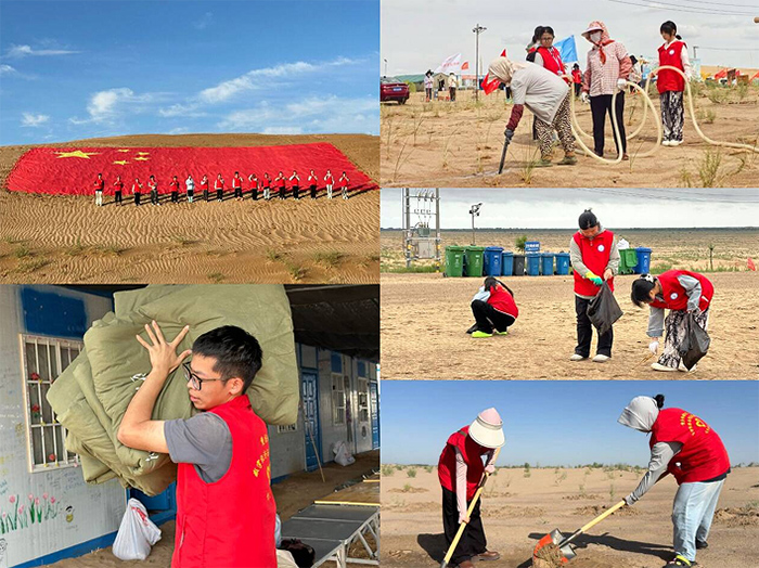 當那面如烈焰般熾熱的巨幅國旗在民勤大漠鋪展,青年學子們以挺拔身姿與赤紅旗幟同框定格——烈日將青春面龐鍍成古銅,風沙在挺拔脊梁刻下印記,這一幀與大國旗的莊嚴合影,不僅定格了新時代青年血脈中奔涌的家國情懷,更將扎根沙海、建設“美麗中國”的誓言鐫刻進浩瀚蒼穹。他們以調研為矛,丈量沙海生態脈搏,在治沙基地的烈日下勾勒生態圖譜;以實踐為犁,俯身荒漠向治沙人躬身求教,讓梭梭苗在掌心學會扎根;以守護為諾,于星夜俯身撿拾散落垃圾,用行動詮釋“綠水青山”的重量;以基建為基,在沙丘間夯筑服務根基,任汗水浸透衣衫化作滋養大地的甘霖。從國旗下的誓言到沙海中的躬行,青年們以青春熱血在瀚海戈壁書寫著屬于這個時代的生態答卷。