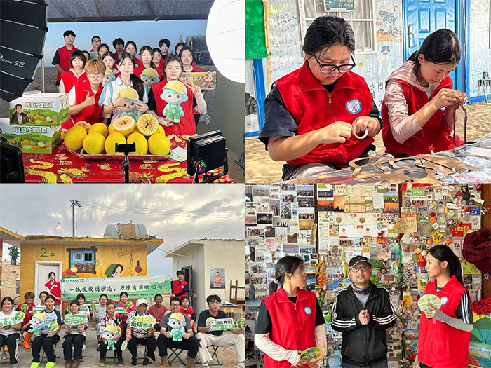 架起鏡頭,實踐團以新媒體作筆,于戈壁灘上繪就綠色嶄新篇章。梭梭回填直播掀起云端治沙熱潮——實時有200余名觀眾在線圍觀,彈幕瘋狂刷屏“種樹技能get”“民勤種樹報名+1”,甘肅直播榜第38名的熱度,讓治沙技術成功破圈,成為全民行動的實用指南。助農直播間里,青年才俊們化身“帶貨詩人”,用“沙漠蜜瓜,甜過初戀”這般鮮活靈動、詩意滿滿的話術,將金黃誘人的蜜瓜送進千家萬戶的餐桌。他們積極探索“科技+電商”的助農新模式,僅憑基地一個擁有8萬粉絲的小號,在短短半小時內,便創下銷量900多單、銷售額2.1萬多元的佳績,累計觀看人數高達1.1萬多人,點贊量更是飆升至11萬,榮登全國生鮮榜第33名。環保課堂搬進直播間,“軟塑料回收指南”引發網友連麥獻策,而在線下“變廢為寶”手工坊中,青年巧手將枯葉、沙粒幻化為藝術裝置,讓循環理念在彈幕與掌聲中落地生根,直播累計吸引在線觀看人數達2000多人,點贊量突破5萬。從云端到沙海,創新的火花正為傳統治沙事業注入源源不斷的澎湃動能,引領著綠色發展的新風尚。