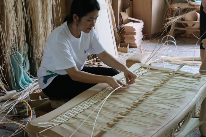 在建益-藤緣家具有限公司生產車間,實踐團成員近距離觀察老師傅們精湛的編織技藝。從藤條篩選、浸泡軟化到手工編織,每一道工序都凝聚著工匠的智慧與心血。"單是編織環節就需大半天時間",公司負責人徐君介紹道。在展廳內,造型精巧的嬰兒搖床、綴著細密流蘇的秋千椅、兼具美觀與實用的小鴨造型果盤等作品,展現了傳統工藝的現代魅力。