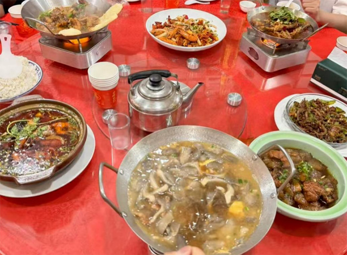 一、初到天柱山,感受特色美食 7月3日中午,實踐團隊的成員們陸續抵達天柱山博物館所在地。盡管旅途奔波,但大家的熱情絲毫未減。在楊立輝老師的帶領下,團隊成員們首先品嘗了當地的特色美食。天柱山地區以其豐富的物產和獨特的烹飪技藝聞名,隊員們圍坐在一起,品嘗著熱氣騰騰的山粉圓子、蘑菇滑肉湯等特色菜肴,感受著當地濃厚的飲食文化氛圍。美食不僅滿足了大家的味蕾,更拉近了團隊成員之間的距離,為接下來的實踐活動注入了滿滿的活力。