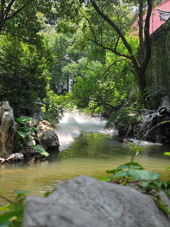 最后,我們來到了后花園。園內種植著松柏、翠竹、玉蘭等草木,四季常青,與青灰色的亭臺相映成趣。園子中央有一方半月形的池塘,池水清澈見底,數十條金魚在水中游弋,紅、白、黑三色的魚鱗在陽光下閃閃發亮,與岸邊的垂柳、水中的倒影構成一幅靈動的畫面。這池魚看似尋常,卻暗含深意:孔子曾說“知者樂水,仁者樂山”,而魚在水中自在生長,正是人與自然和諧共生的寫照,恰如其“天人合一”的思想——人不必刻意征服自然,而是要順應自然規律,在與天地萬物的相處中實現平衡與安寧。