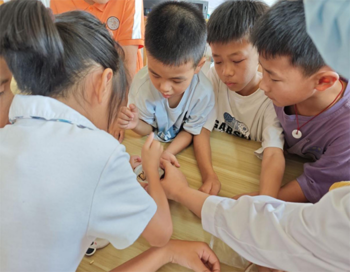 在四邑村養(yǎng)老服務驛站二樓的兒童托管班里,志愿服務隊的同學們用風趣而通俗易懂的語言為留守兒童介紹了中醫(yī)藥傳統(tǒng)文化知識、教小朋友們識別常見的中草藥,指導小朋友們進行中藥研磨、香囊制作,小朋友們都忙得不亦樂乎,中醫(yī)藥文化的種子正在孩子們的心中萌芽。此外,實踐隊還為留守兒童帶來了人體結構示意圖片和3D人體器官模型粘土制作材料,為小朋友們普及了人體器官結構知識,引導小朋友們構建人體結構,更是激發(fā)了小朋友們的醫(yī)學求知欲望。5歲的亮亮拿著自己拼好地人體器官沖出教室,興奮地對外面正在接受義診的張奶奶說“奶奶,這是我的小心臟、這是我的肝、這是我的小肚子,我都會認啦!”,慈祥的張奶奶和義診大廳的人聽了都笑得合不攏嘴。