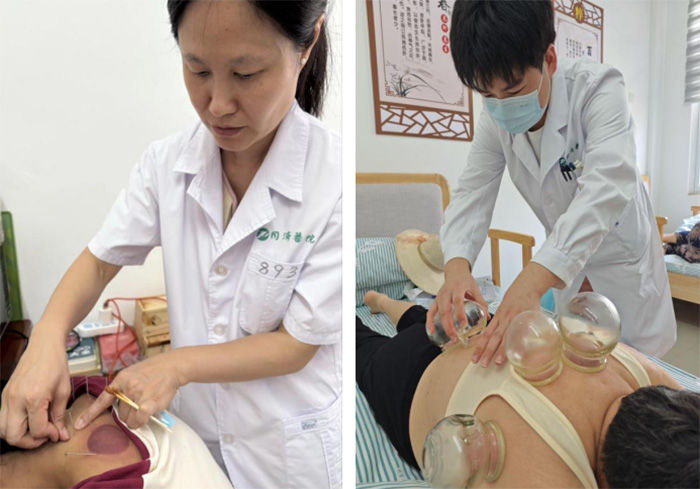 放射科護士長李琴老師首先對村民們進行了放射科基礎檢查的小科普講座,讓村民朋友對X線、CT、MRI檢查有了初步的認識,了解到影像檢查對疾病診治的重要性。在實踐隊對村民們進行基礎身體檢查、填寫調查問卷(老年人簡易智力量表、抑郁量表、日常生活能力測評等9種量表)的同時,黃波和余玲玲老師向村民們普及了針刺、艾灸、推拿、拔火罐等中醫(yī)治療手段,并重點介紹了合谷、足三里、三陰交、陽陵泉、百會等常見穴位及其功效,現(xiàn)場反應熱烈,村民們興趣濃厚。隨即,實踐隊以飽滿的熱情為村民進行了針刺、艾灸、推拿、拔火罐等中醫(yī)特色治療,現(xiàn)場人頭攢動,中醫(yī)理療室內座無虛席!