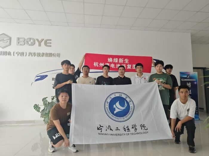 參觀活動結束時,師生們與公司代表在企業LOGO墻前合影留念。同學們高舉"煥綠新生 杭州灣電池修復 團"的紅色橫幅與寧波工程學院校旗,記錄下這一意義非凡的時刻。通過本次參觀,同學們不僅拓寬了專 業視野,更深刻感受到了汽車產業創新發展的脈搏,為今后的學習與職業規劃奠定了堅實基礎。