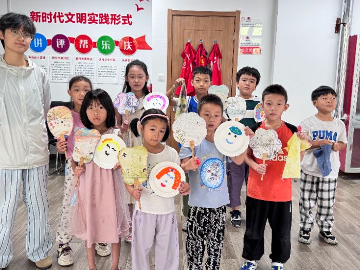 體驗扎染文化的那天,隊員們先向孩子們講解了扎染的歷史淵源和所需工具,隨后指導大家嘗試折疊扎、螺旋扎等基礎技法。孩子們親手完成面料染色、拆結、沖洗等步驟,當那些獨一無二的扎染方巾被晾曬在陽光下時,他們眼中洋溢著滿滿的成就感。情緒臉譜制作課上,超輕粘土在孩子們的指尖靈動變幻,“開心”的眉眼、“驚訝”的表情、“委屈”的神態躍然呈現。用亮片點綴出的“激動”、用細線勾勒出的“淚痕”,讓抽象的情緒有了鮮活的具象表達。而故事分享環節,更讓孩子們的心聲在交流中緊緊相連。漆扇制作進階課程里,素凈的木扇在孩子們的巧手下煥發光彩。經過淺色漆料打底、細筆勾勒,山水、花卉、幾何紋樣逐漸顯露出雛形,傳統工藝與孩童創意在扇面巧妙碰撞,綻放出別樣的美感。
