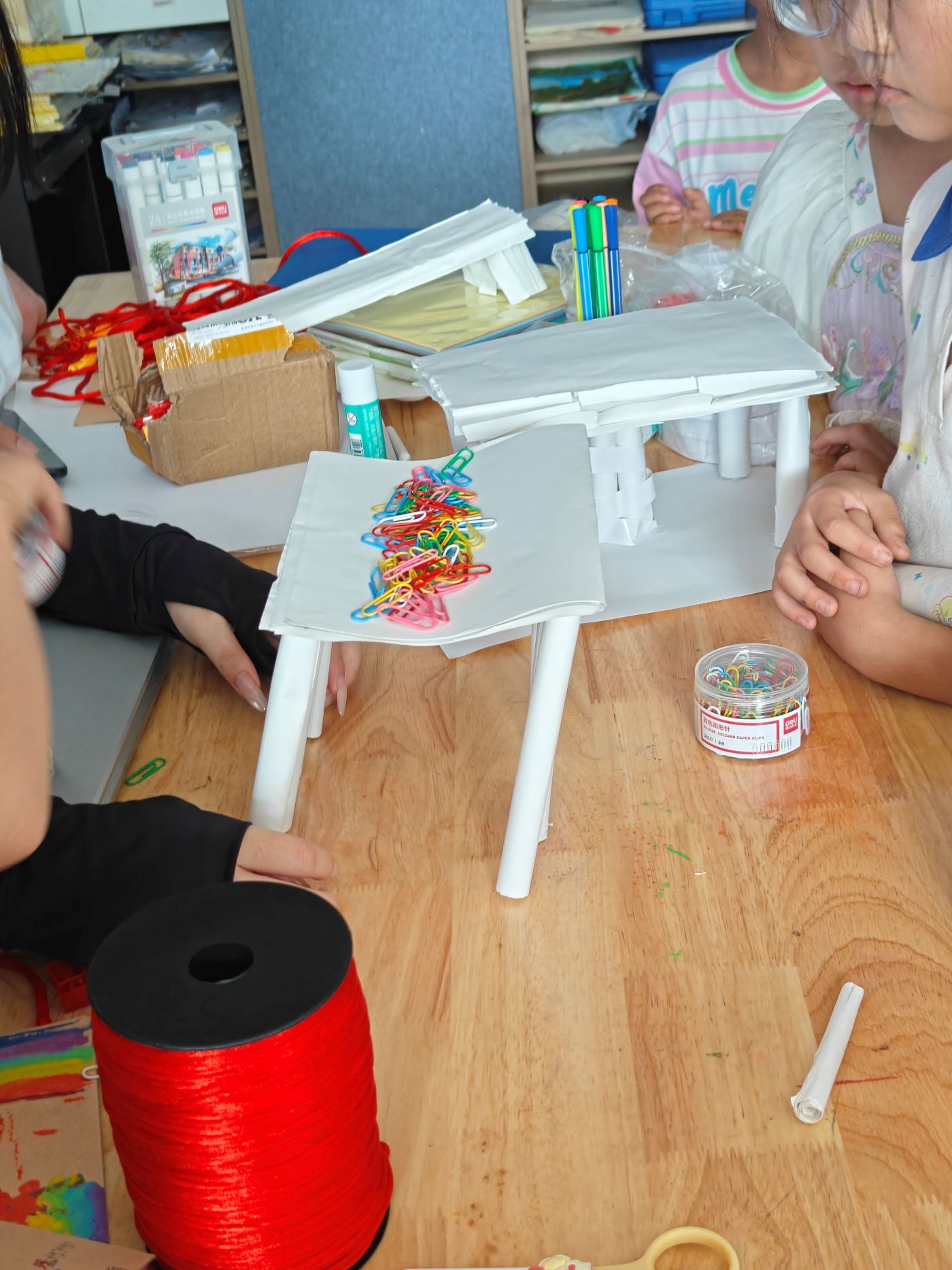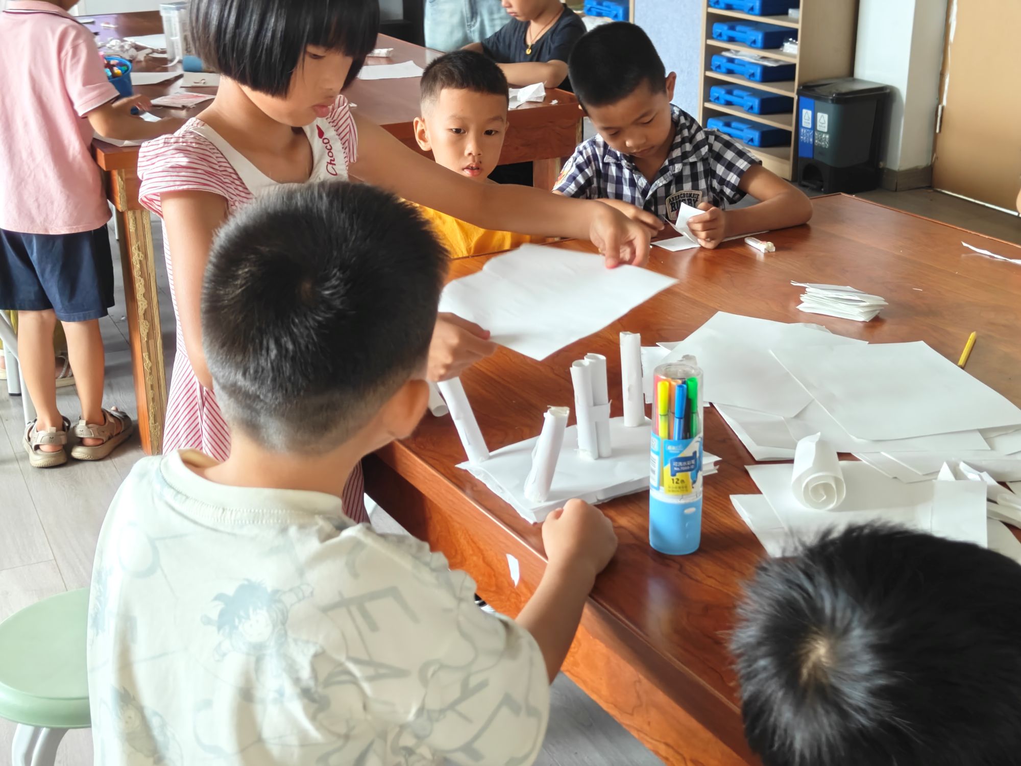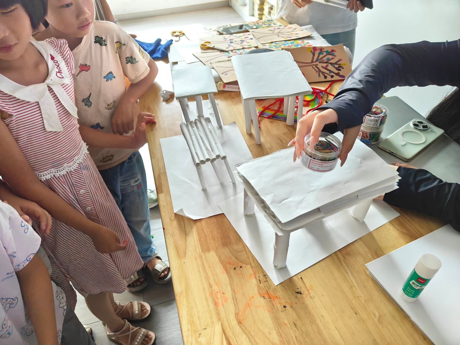 理論講解后,實踐環節正式開啟。老師們給每個小組分發A4紙、剪刀、膠水等工具,同時展示PPT上不同結構紙橋的示例——有純三角形搭建的,有多層折疊加固的,也有結合多種形狀的。“大家可以參考這些設計,也能發揮創意,小組合作搭出最厲害的紙橋!” 話音剛落,孩子們便忙碌起來。 小組內分工明確,有的負責設計草圖,有的動手裁剪紙張,還有的嘗試折疊、粘貼。過程中狀況不斷,紙張裁剪尺寸不對、粘貼不牢橋身變形…… 但孩子們沒有氣餒。老師們穿梭在各組間,隨時提供幫助與建議,引導孩子們思考如何優化結構、分散受力。