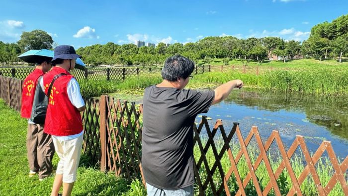 8月8日上午,團隊驅(qū)車來到滆湖公園,抵達隸屬于江蘇省常州環(huán)境監(jiān)測中心的全國首個地級市環(huán)境監(jiān)測綜合性特色野外臺站——滆湖生態(tài)觀測試驗中心展館,在生物監(jiān)測專家王雷的引導下,隊員們在這個生態(tài)保護的觀測基地、科研基地和科普基地開啟了一場貼近自然的“生態(tài)課堂”。