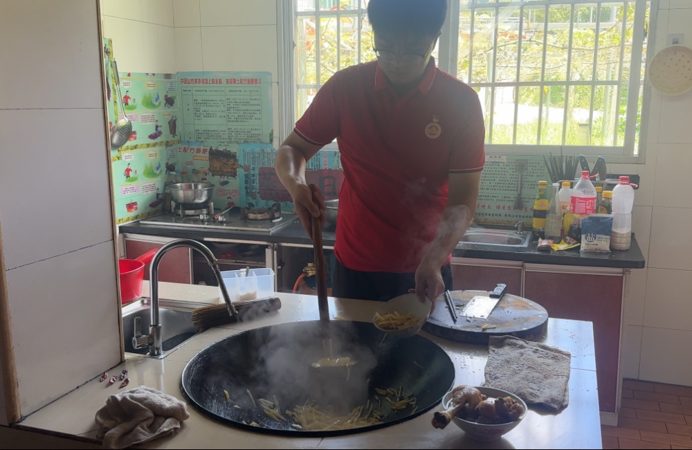 自作紅軍餐:共品農(nóng)家味,厚植魚水情 跨越三公里綠水青山,團隊抵達壩上紅軍村。老鄉(xiāng)提前備好新鮮食材,隊員們迅速分工:年輕姑娘們準備碗筷,小伙子們劈柴生火,有烹飪經(jīng)驗的劉宇同學(xué)系上圍裙掌勺,嫻熟地翻炒著土豆絲,灶膛里柴火噼啪作響,鐵鍋上熱氣升騰,飯菜的香味彌漫在屋中,贏得了眾人的稱贊。