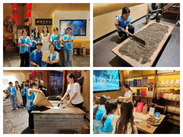 在中國茯茶文化博物館,講解員的引領讓成員們透過史料,清晰觸摸到茯茶晉升國家地理標志的輝煌軌跡。在開放式非遺工坊,成員們在非遺傳承人的指導下親手體驗制茶。從清選、切茶、過篩再到炒茶、筑茶、捆綁,這場沉浸式實踐不僅讓大家深入理解了每道工序背后的工藝原理,更在指尖與茶葉的親密接觸中,真切體悟到傳統技藝里沉淀的工匠精神。