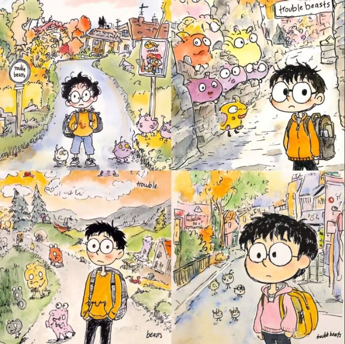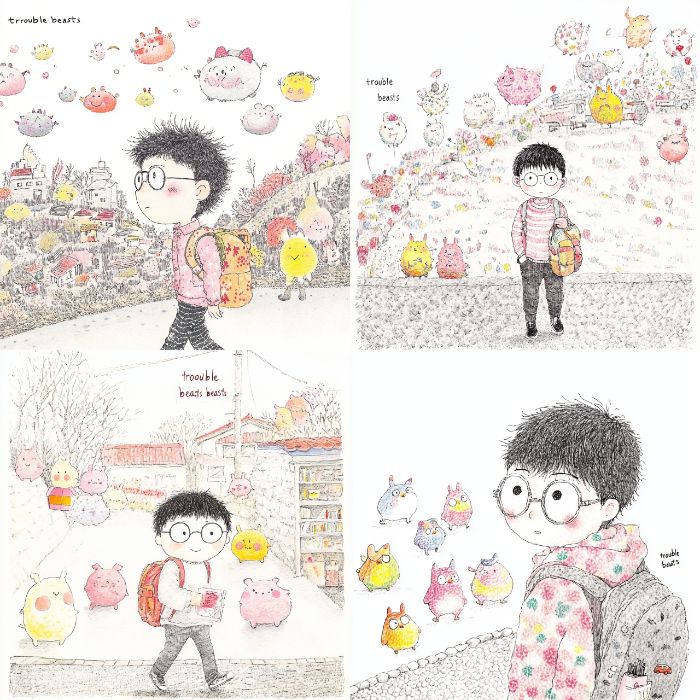 隨后,運用 Midjourney、即夢等 AI 工具繪制創(chuàng)作底稿,經(jīng)過數(shù)輪調(diào)整色彩、優(yōu)化細節(jié),既賦予畫面生動的表現(xiàn)力與深刻的情感共鳴,又傳遞著“勇敢面對”的力量。繪本里的主人公,從逃避學習挫折、人際煩惱,到主動尋找解決辦法,每一頁都浸潤著團隊成員對“兒童視角”的尊重。