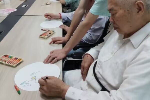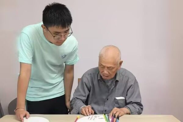 活動現場,實踐隊以精心準備的紅色盲盒等色卡、實物道具為依托,通過“指認顏色”“配對相同色”等趣味小游戲開啟互動。在輕松氛圍里,老人們既鍛煉觀察力,又收獲溫暖。小游戲后,合唱環節點燃熱情。《歌唱祖國》前奏響起,老人與隊員們不自覺挺直腰背,用飽含深情的歌聲,傳遞對祖國的熱愛;《大海啊故鄉》旋律流淌,幾位老人眼中泛起溫情,輕晃節奏,似在歌聲中回溯難忘過往。兩代人借歌聲聯結,將愛國熱忱與生活信念融入旋律,推向活動高潮。最后的繪畫環節,實踐隊分發畫紙、彩筆,和老人共繪“多彩篇章”。隊員陪老人作畫,雖畫面簡單,卻滿是真摯情誼,每一筆都藏著彼此的快樂。