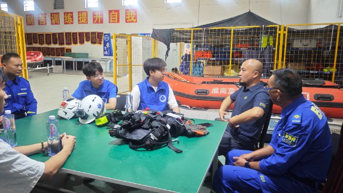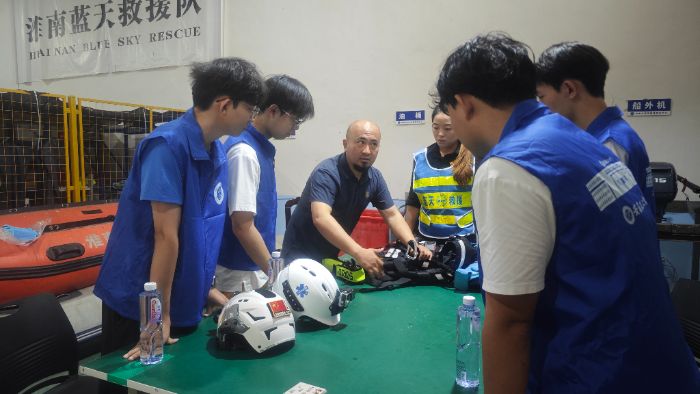 探秘救援基地,解鎖裝備“密碼” 上午,調研團成員抵達藍天救援隊訓練基地,剛踏入基地,各類擺放整齊的專業救援裝備便吸引了大家的目光。藍天救援隊副隊長熱情接待團隊,隨后以“實物講解+場景還原”的方式,為成員們詳細介紹裝備知識——從基礎的救生衣、救生圈等常規救生設備,到具備定位、探測功能的先進水下探測儀器,再到應對復雜水域救援的沖鋒舟、救援繩索系統,副隊長不僅講解了每類裝備的核心功能,還結合過往救援案例,分享了裝備在不同場景下的使用技巧與注意事項。