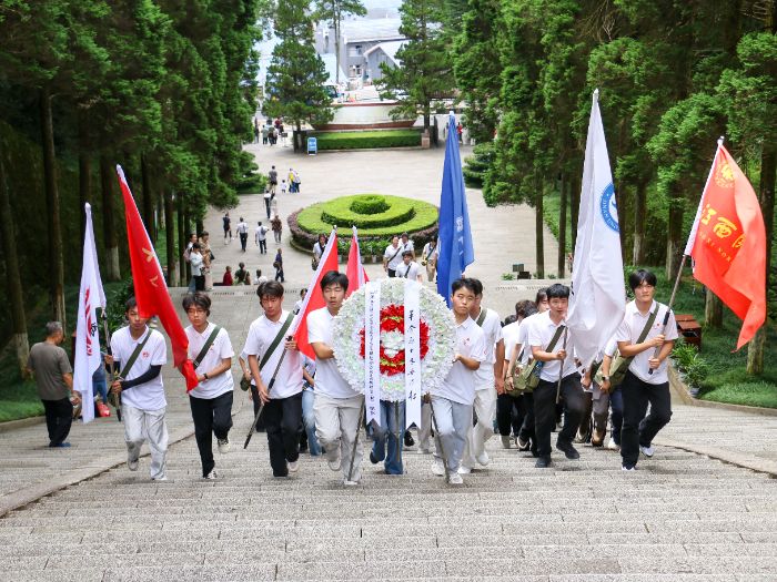 中午前,實踐團來到井岡山烈士陵園,莊嚴舉行獻花儀式。兩名隊員手抬花圈,緩步走向紀念碑,將花圈鄭重擺放在碑前。全體學員進入瞻仰大廳,在漢白玉墻上刻有的“死難烈士萬歲”六個大字前深深鞠躬,并肅立默哀。潔白的花圈莊重圣潔,凝聚著大家對革命先烈無限的哀思與崇高的敬意。