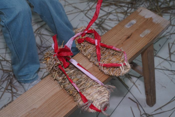 晚上七點,實踐團開展了一堂特別的勞動體驗課:編草鞋。在井岡山斗爭時期,物資極度匱乏,紅軍戰(zhàn)士們依靠自制草鞋應(yīng)對崎嶇山路和頻繁行軍。在兩位編織師傅的耐心指導下,同學們親手體驗了草鞋編織的全過程。這項技藝看似簡單,實則非常考驗?zāi)托暮图记伞?br />“沒想到編草鞋這么難,草繩總是編不緊,”一位同學專注地調(diào)整手中的草繩,低聲感嘆道,“而且,步驟一多就容易亂。紅軍戰(zhàn)士當年不但要編得好,還要穿著行軍打仗,太不容易了。”