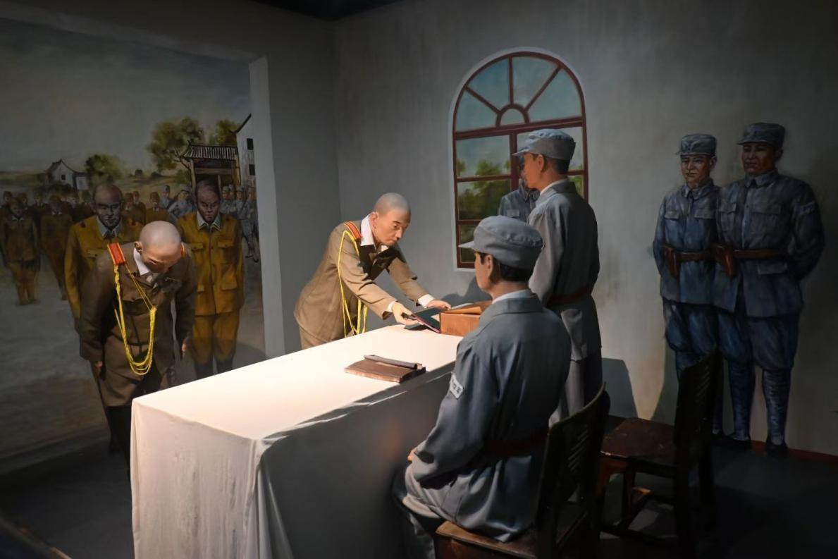 館內一座復原的受降簽字場景吸引了小分隊的目光。場景中的人物蠟像、桌椅布置及燈光效果重現了1945年日軍代表遞交投降書的重要歷史時刻。小分隊在此處停留,紀念抗戰勝利榮耀之時。