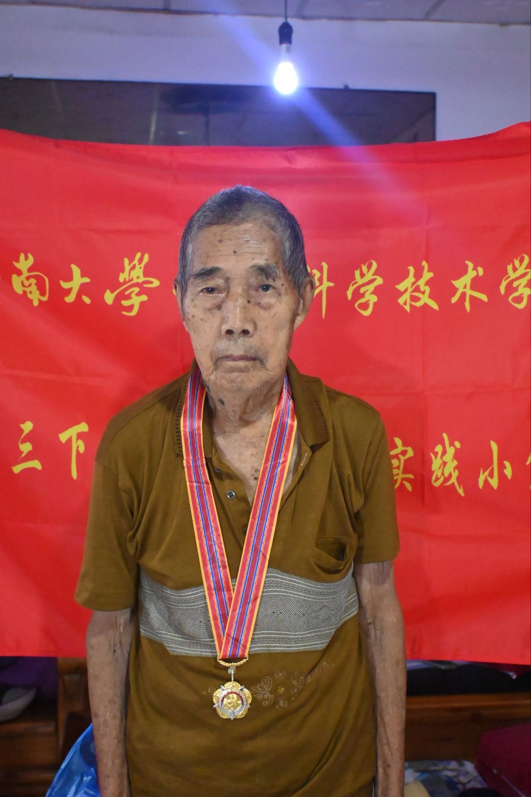 圖為李老戴獎章和隊旗合照 湖南懷化芷江小分隊供圖