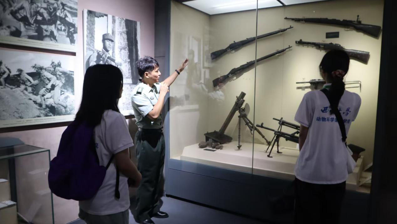隨后小分隊來到中國人民抗戰勝利受降紀念館,參觀館內抗戰文物和歷史照片。走入受降紀念館,迎面是巨大“V”形黑色雕塑,象征勝利(Victory),其上是1945.8.21一行數字,這是中國接受日本投降,抗戰完全勝利的開端。館內陳列多種歷史文物,一件件抗戰實物和圖像資料較為完整地呈現出當年真實歷史場景。隊員們在陳列館前駐足聆聽講解員的介紹,深入了解當年的歷史細節,觀看芷江受降的全部過程。在兵器陳列區,軍用重機槍和步槍刺刀等武器展現出抗戰時期的武器裝備水平,部分軍人制服上還遺留有當年的彈藥痕跡。