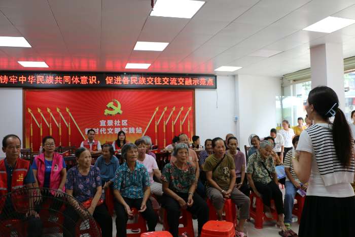 宜景社區(qū)作為寧明縣易地搬遷安置點,于2018年建成,集中了來自全縣8個鄉(xiāng)鎮(zhèn)的663戶、2467名搬遷群眾,民族成分豐富,同時也是崇左市各族群眾互嵌式發(fā)展計劃示范點,在促進各民族交往交流交融中發(fā)揮重要作用。服務團緊扣鑄牢中華民族共同體意識主線,結合社區(qū)實際開展系列活動,既強化居民對“中華民族一家親”的認同,也通過在地化、適老化服務提升社區(qū)幸福感,更在實踐中深化了團隊服務邊疆的初心。本次活動以三大核心環(huán)節(jié)展開,將非遺文化傳承、心理健康教育與民族團結宣講深度融合。