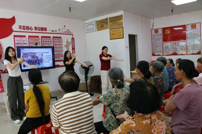 下午,服務團圍繞心理健康服務,開展了一場針對老年群體的心理健康講座。團隊成員通過講解與互動問答,向居民普及健康五大原則、心理健康十條標準、六大健康心理特征及心理調節(jié)方法,并帶領居民學習《清肺拍拍操》,從動作教學到跟隨音樂完整練習,社區(qū)居民全程熱情參與,現場氛圍歡快,在運動中守護身心健康。