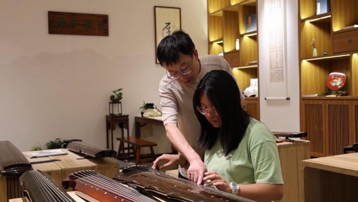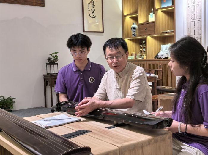 實踐團(tuán)還實地觀摩了唐大師的古琴教學(xué)現(xiàn)場,看到他以傳統(tǒng)技法為核心,結(jié)合學(xué)生實際需求調(diào)整教學(xué)方式,手把手指導(dǎo)學(xué)員彈奏,從基礎(chǔ)指法到情感表達(dá),細(xì)致入微地傳遞廣陵琴派的技藝與文化。唐大師常說:“廣陵琴派的傳承,不僅是技藝的傳遞,更是文化的延續(xù)。每一個學(xué)生都是文化傳承的火種。”這種將教學(xué)與傳承使命深度融合的理念,讓實踐團(tuán)成員深受觸動。