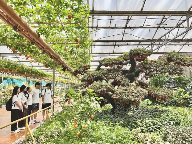 在蔬菜文化藝術館,形態各異的蔬菜雕塑,創意十足的景觀造型,農業與藝術巧妙融合讓實踐隊成員眼前一亮。景觀與蔬菜融為一體,蔬菜作物搭配紅色元素,這正是壽光實現農業全鏈蝶變,拓展農文旅融合發展,讓土地生出致富希望的生動實踐。
