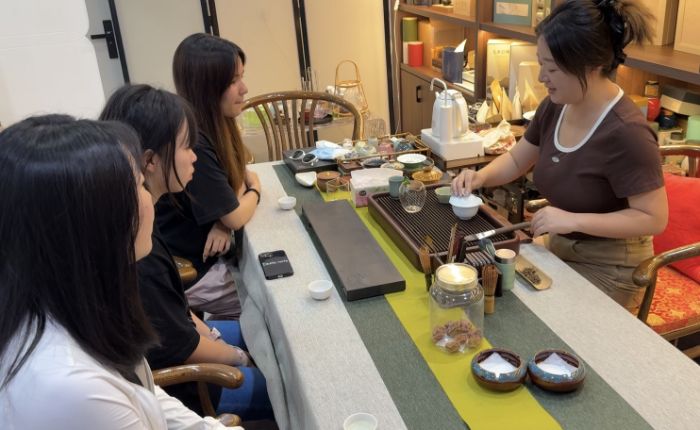為深挖茶文化,成員們專程拜訪茶藝?yán)蠋煛T诓枋抑校蠋煖乇瓭嵕摺⑼恫枳⑺瑒?dòng)作舒緩優(yōu)雅。德旺白茶在壺中舒展,清香氤氳。老師細(xì)述沖泡技巧與品鑒要領(lǐng),成員們凝神聆聽(tīng),頻頻記錄。老師以茶喻人:“茶要經(jīng)揉捻才能釋放芬芳,青年也要經(jīng)實(shí)踐方能成長(zhǎng)。”一句話,讓茶香與青春在那一刻同頻共振。大家更堅(jiān)定了以專業(yè)所學(xué)推廣德旺茶文化的決心,也為后續(xù)在德旺土家族苗族鄉(xiāng)開(kāi)展茶產(chǎn)業(yè)振興實(shí)踐活動(dòng)積累了寶貴的專業(yè)知識(shí)。大家都表示,要將所學(xué)運(yùn)用到實(shí)際中,為推廣當(dāng)?shù)夭栉幕暙I(xiàn)自己的力量。